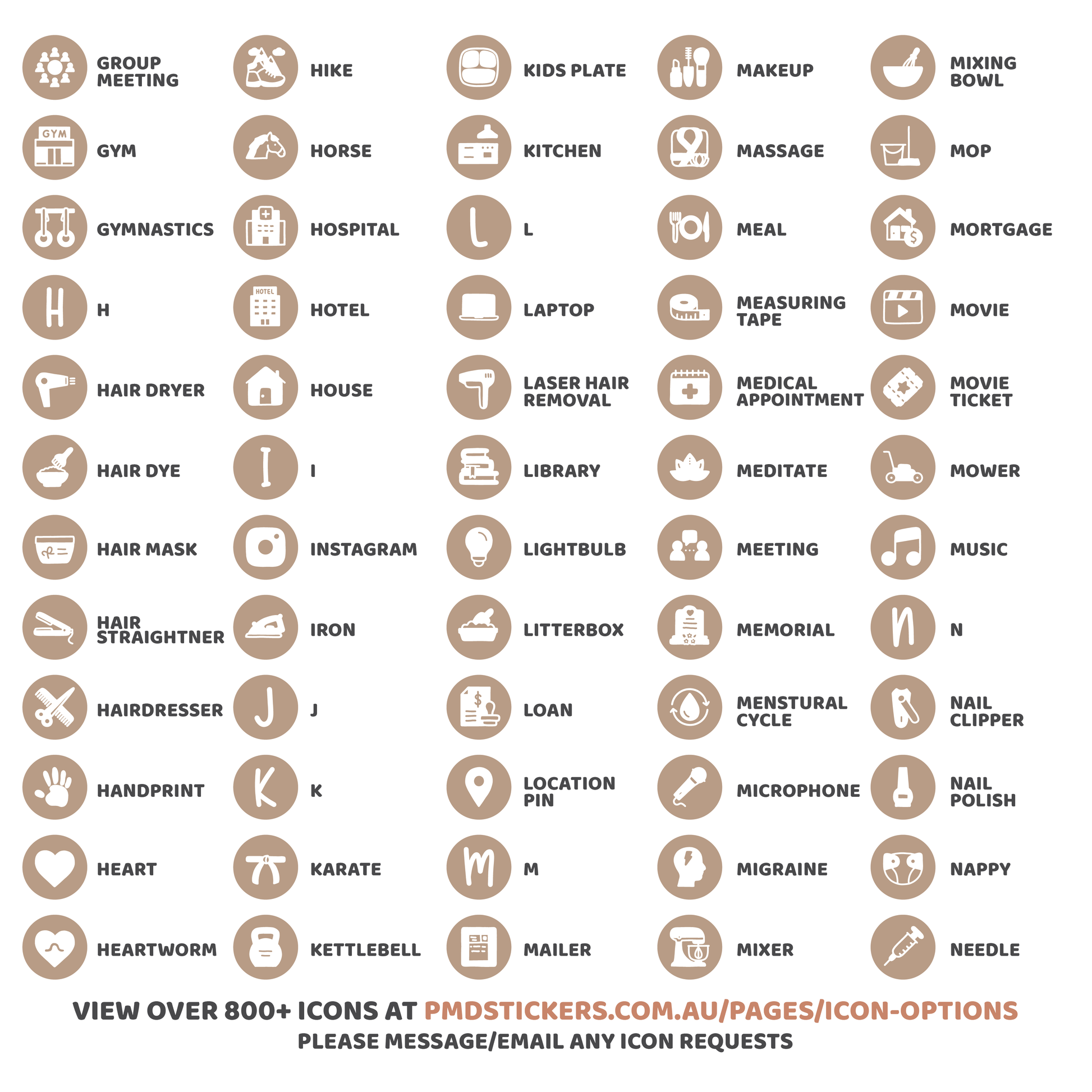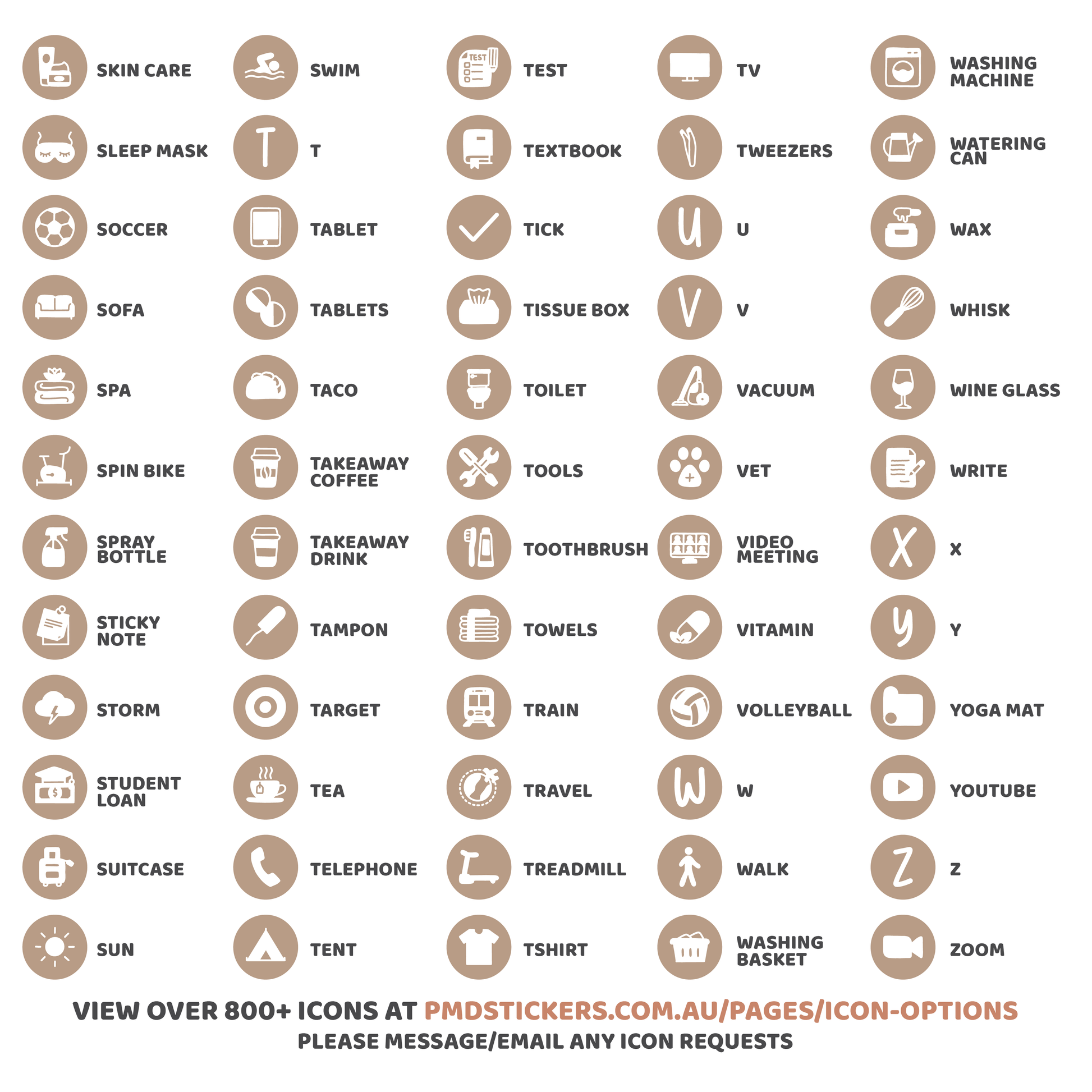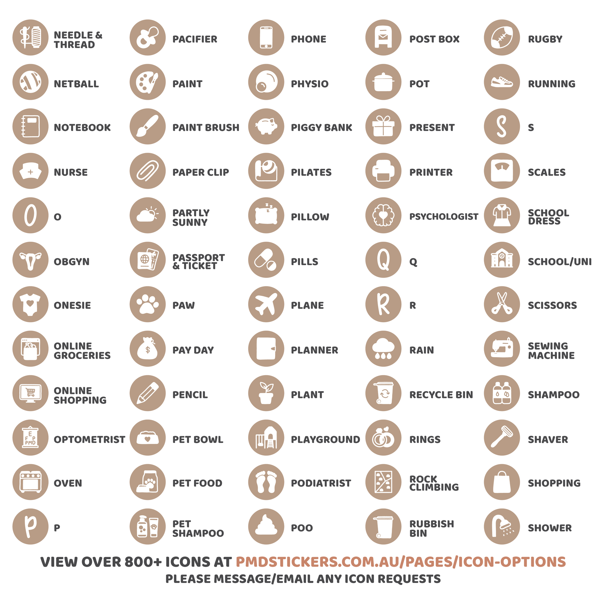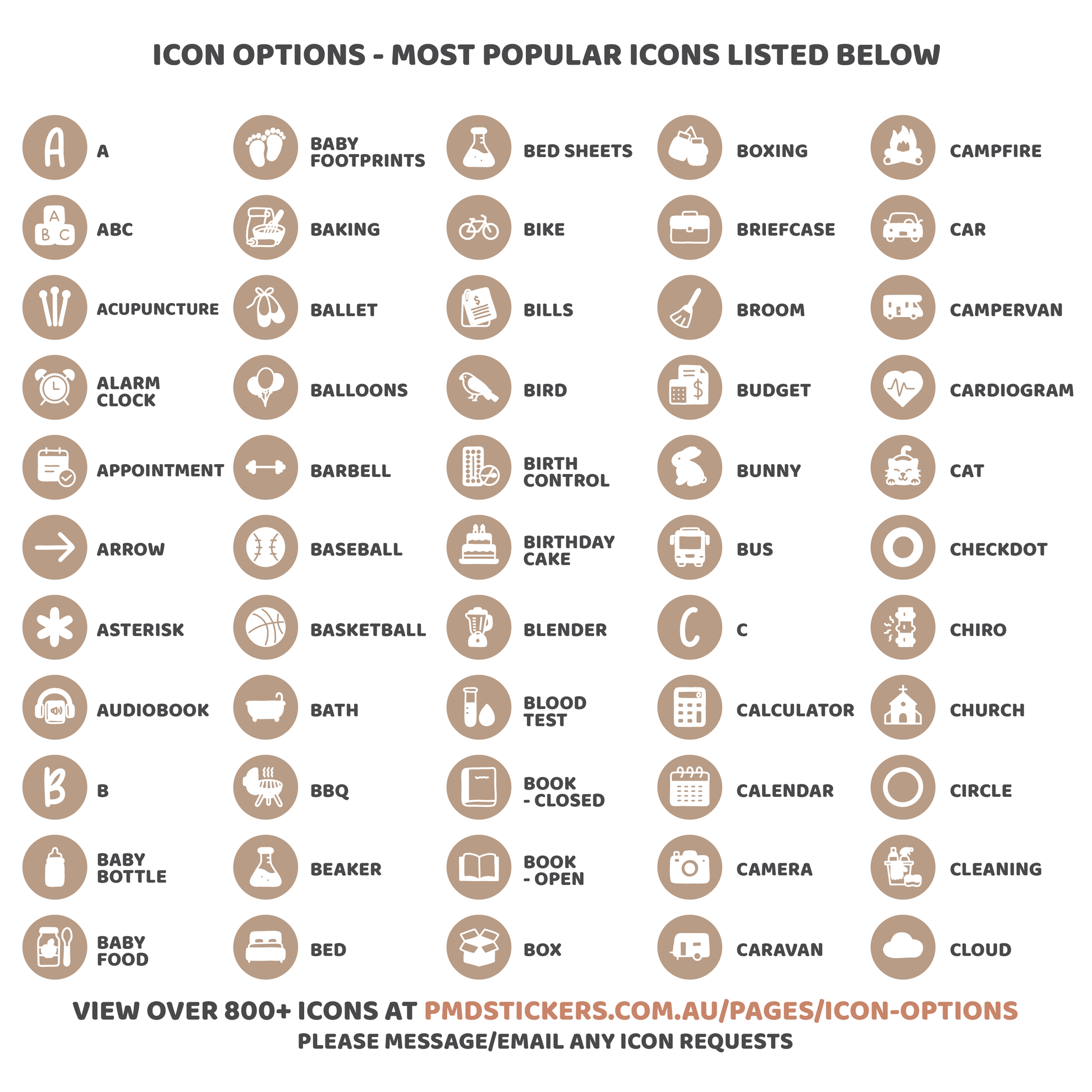 Colour Icon Dot planner stickers - 800+ icon options - 1 icon per sheet
